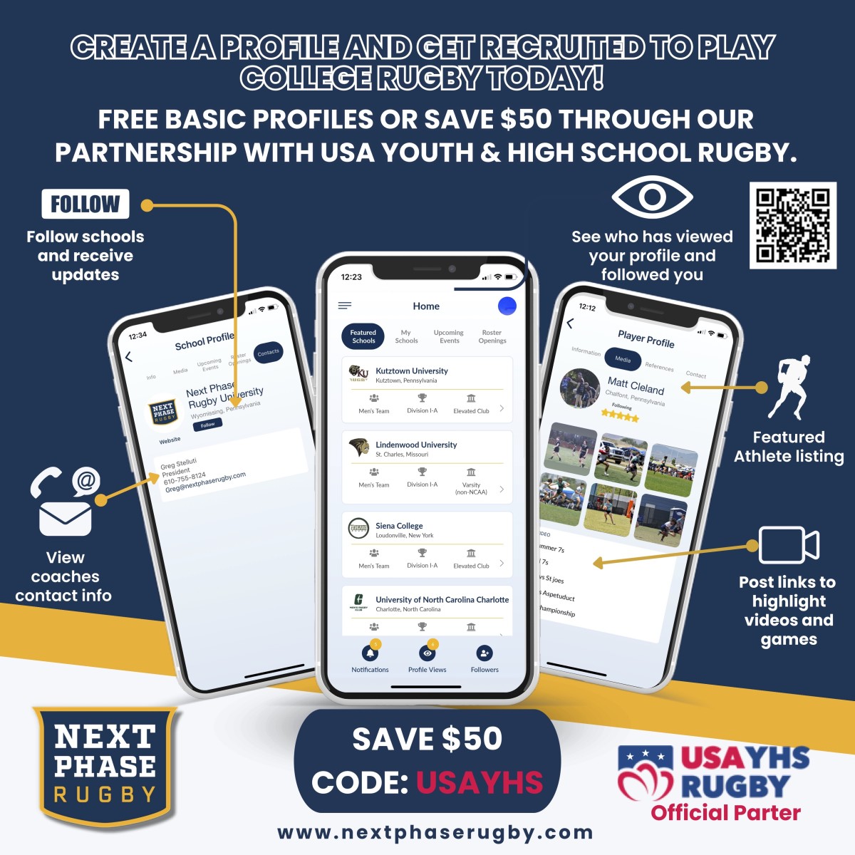 Connect with college rugby programs through the Next Phase Rugby app. Register at NextPhaseRugby.com, download the app, confirm your email, and then log into the app to set up your profile. Use the discount code USAYHS to get 25% off the premium membership for bigger and better features!