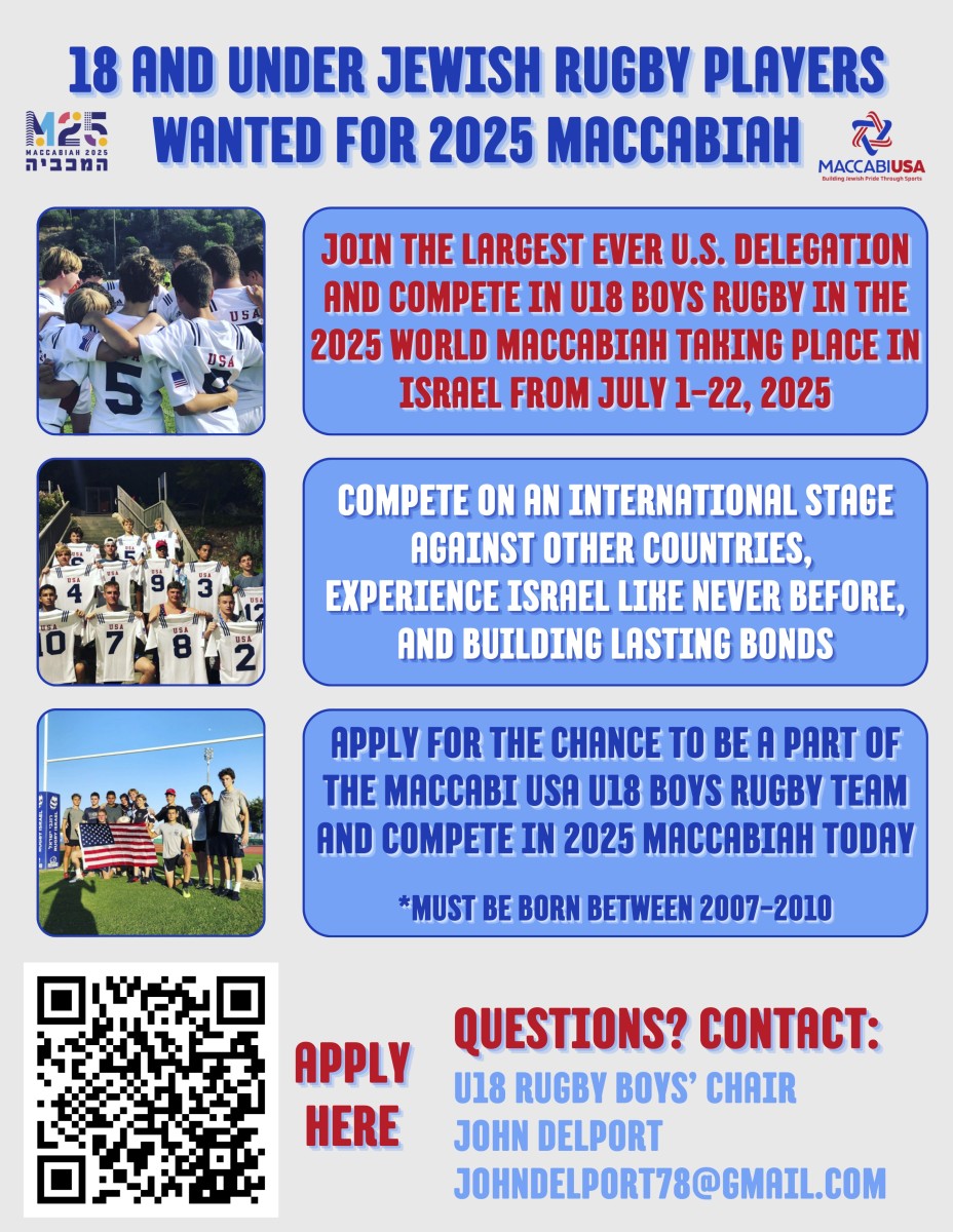 The Maccabi USA U18 rugby team is looking for players for the Maccabi Games slated for July 2025.