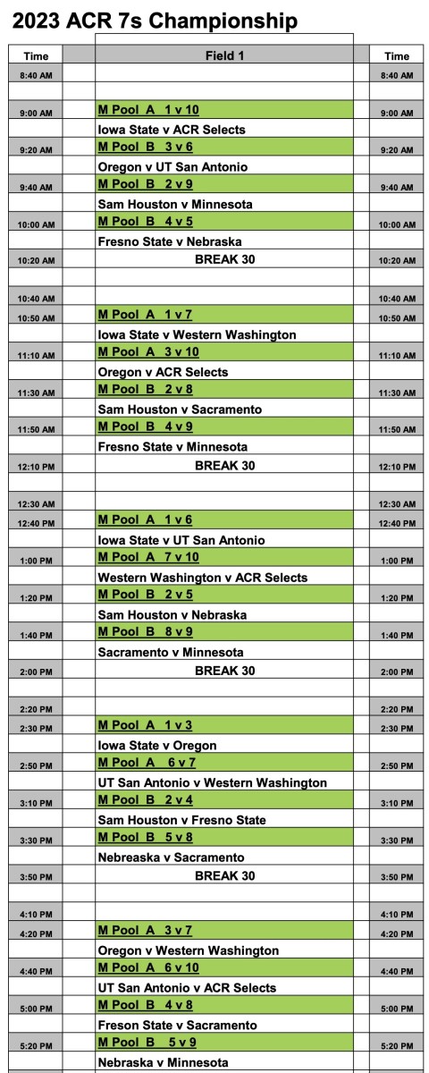Ten teams, nine from colleges plus a selects team to round out the field, fills out a robust D1 men's bracket. In addition to teams such as Iowa State, Western Washington, and Sam Houston State, that went deep into the ACR 15s playoffs, some teams that played in CRAA's California Conference, namely championships Sacramento State and runners-up Fresno State, join in.